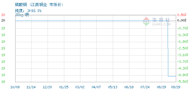 06月30日江西铜业关于硫酸铜的报价为20元/公斤。硫酸铜的规格:纯度:≥98.5% 25kg/袋。该报价有效期为3天。报价提供方:广州市展恩化工有限公司。