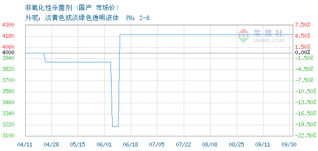 07月09日国产关于非氧化性杀菌剂的报价为4200元/吨。非氧化性杀菌剂的规格:外观:淡黄色或淡绿色透明液体 PH:2-6 。该报价有效期为3天。报价提供方:山东富盛永商贸有限公司。