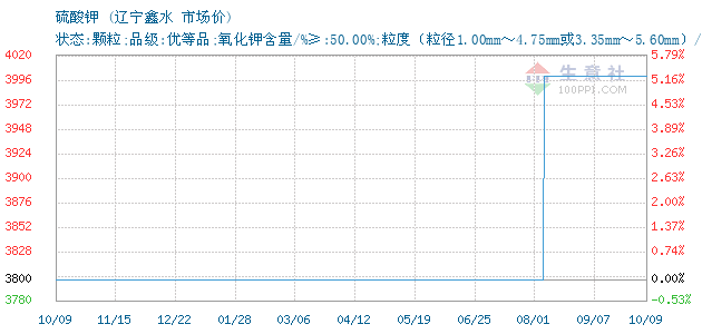 07月09日辽宁鑫水化工集团有限公司关于硫酸钾的报价为3800元/吨。硫酸钾的规格:状态:颗粒;品级:优等品;氧化钾含量/%≥:50.00%;粒度(粒径1.00mm~4.75mm或3.35mm~5.60mm)/%≥:90 ;。该报价有效期为3天。报价提供方:山东汉邦科学仪器有限公司。