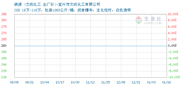 10月20日文成化工关于碳源的报价为260元/吨。碳源的规格:COD 16万-140万,包装1000公斤/桶,或者槽车,生化性好,白色透明。该报价有效期为3天。报价提供方:宜兴市文成化工有限公司。