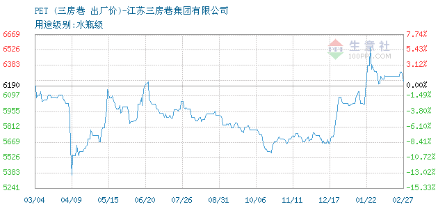 10月27日江苏三房巷集团有限公司关于PET的报价为5680元/吨。PET的规格:用途级别:水瓶级。该报价有效期为7天。报价提供方:江苏三房巷集团有限公司。