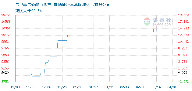 11月12日国产关于二甲基二硫醚的报价为9020元/吨。二甲基二硫醚的规格:纯度大于99.5%。该报价有效期为3天。报价提供方:本溪隆沣化工有限公司。
