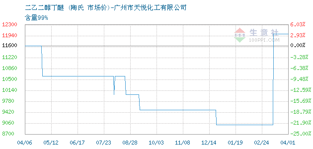 11月15日陶氏关于二乙二醇丁醚的报价为9500元/吨。二乙二醇丁醚的规格:含量99%。该报价有效期为3天。报价提供方:广州市天悦化工有限公司。