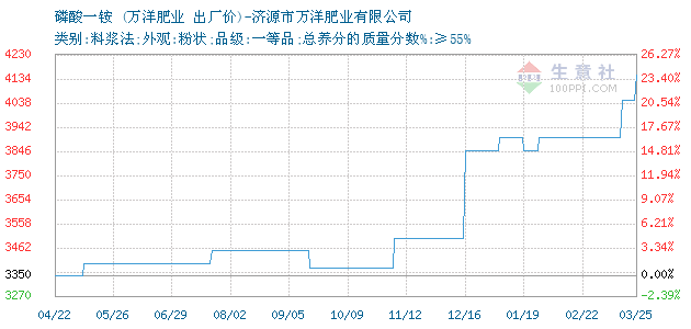 12月16日济源市万洋(肥业)有限公司关于磷酸一铵的报价为3850元/吨。磷酸一铵的规格:类别:料浆法;外观:粉状;品级:一等品;总养分的质量分数%:≥55%。该报价有效期为3天。报价提供方:济源市万洋肥业有限公司。