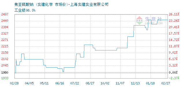 08月30日实建化学关于焦亚硫酸钠的报价为2460元/吨。焦亚硫酸钠的规格:工业级96.5%。该报价有效期为3天。报价提供方:上海实建实业有限公司。