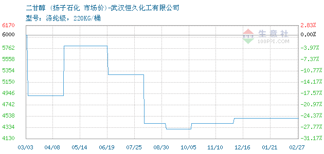 10月30日扬子石化关于二乙二醇的报价为5500元/吨。二乙二醇的规格:型号:涤纶级,220KG/桶。该报价有效期为3天。报价提供方:武汉恒久化工有限公司。