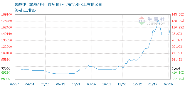 11月16日江西赣锋锂业股份有限公司 关于碳酸锂的报价为155000元/吨。碳酸锂的规格:级别:工业级。该报价有效期为3天。报价提供方:上海溶和化工有限公司。