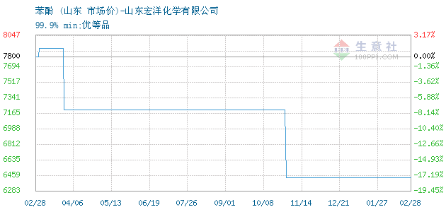 11月20日山东地区关于苯酚的报价为8600元/吨。苯酚的规格:99.9% min;优等品。该报价有效期为1天。报价提供方:山东宏洋化学有限公司。