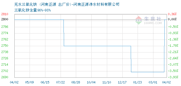12月21日河南正源关于无水三氯化铁的报价为2850元/吨。无水三氯化铁的规格:三氯化铁含量96%-98%。该报价有效期为3天。报价提供方:河南正源净水材料有限公司。