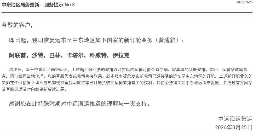 On March 25, 2026, COSCO SHIPPING Lines (hereinafter referred to as "COSCO SHIPPING Lines") officially issued a service notice, announcing the resumption of new bookings for standard containers from the Far East to six countries in the Middle East—United Arab Emirates, Saudi Arabia, Bahrain, Qatar, Kuwait, and Iraq—effective immediately. This move comes just 21 days after the company suspended related services.